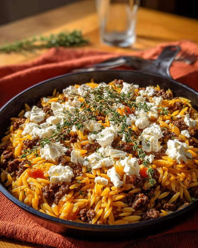 Griechischer Orzo mit Hack und Feta einfach zubereiten.