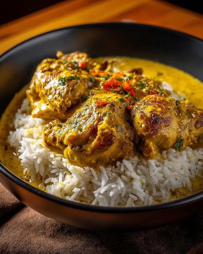Saftiges Hühnchen Curry mit Reis begeistert jeden Gaumen!